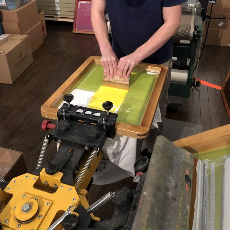 After that, you can sign up for a 4-hour block to screenprint your own projects in the shop on our 4-color press. This includes access to our heating element, flashing equipment, ink, and other small tools and materials. This does not include apparel and screens. You keep your screen after creating it here, we do not store screens for you.